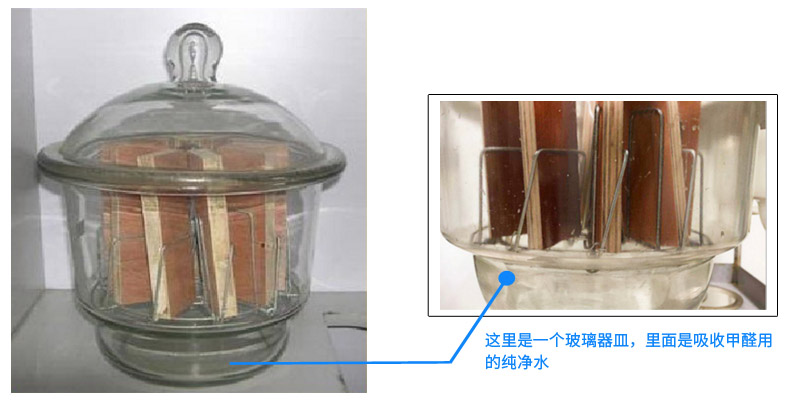 你看看上面那張表,表中的《人造板及其制品用甲醛清除劑清除能力的測(cè)試方法》,這個(gè)方法是檢測(cè)人造板甲醛釋放量方法,專(zhuān)業(yè)上稱(chēng)之為“干燥器法”。就是把10塊切割成15cm×5cm的人造板,放到這個(gè)10升的玻璃容器里,密閉24小時(shí)。24小時(shí)中,人造板不停地釋放甲醛,在玻璃容器的底部,放著一個(gè)盛著純凈水的玻璃器皿,人造板釋放出來(lái)的甲醛被吸收在水中,然后檢測(cè)水中的甲醛,所得數(shù)值就是人造板甲醛釋放量。