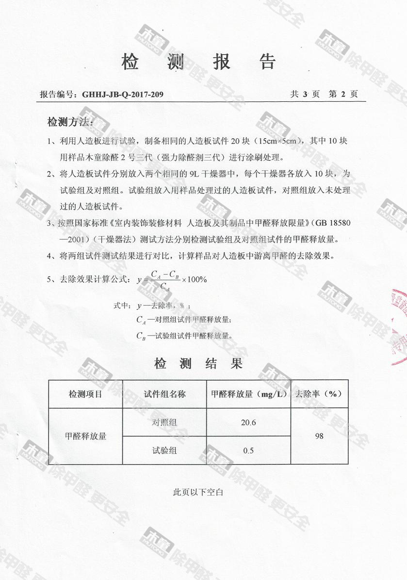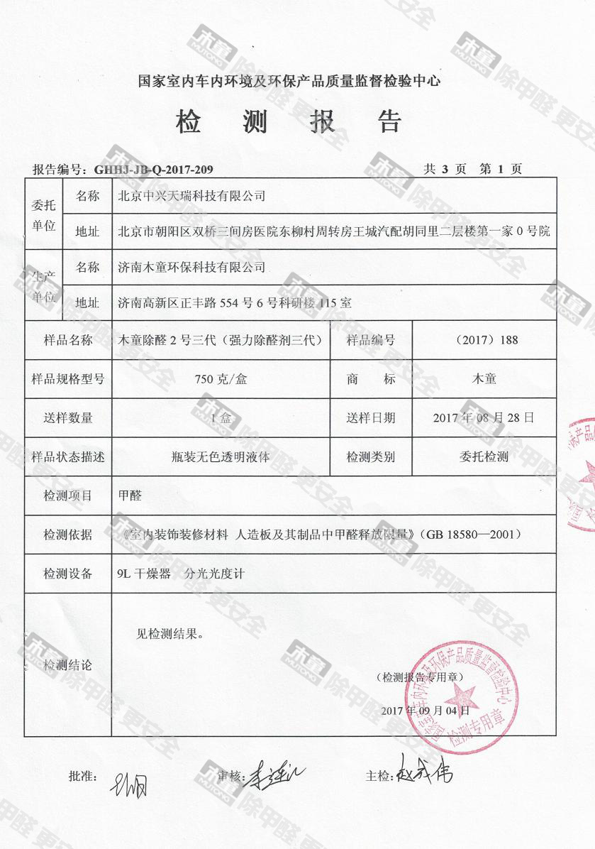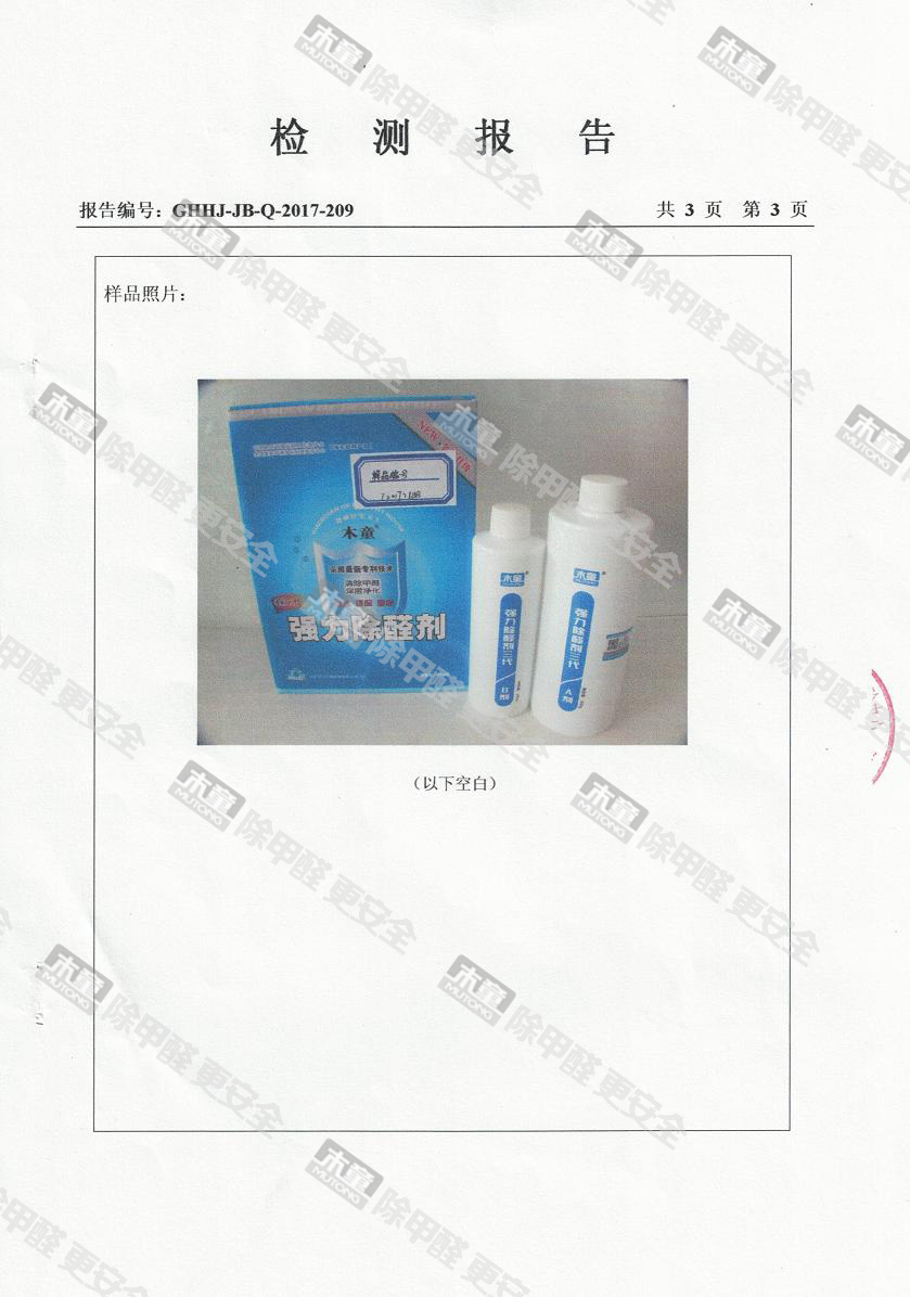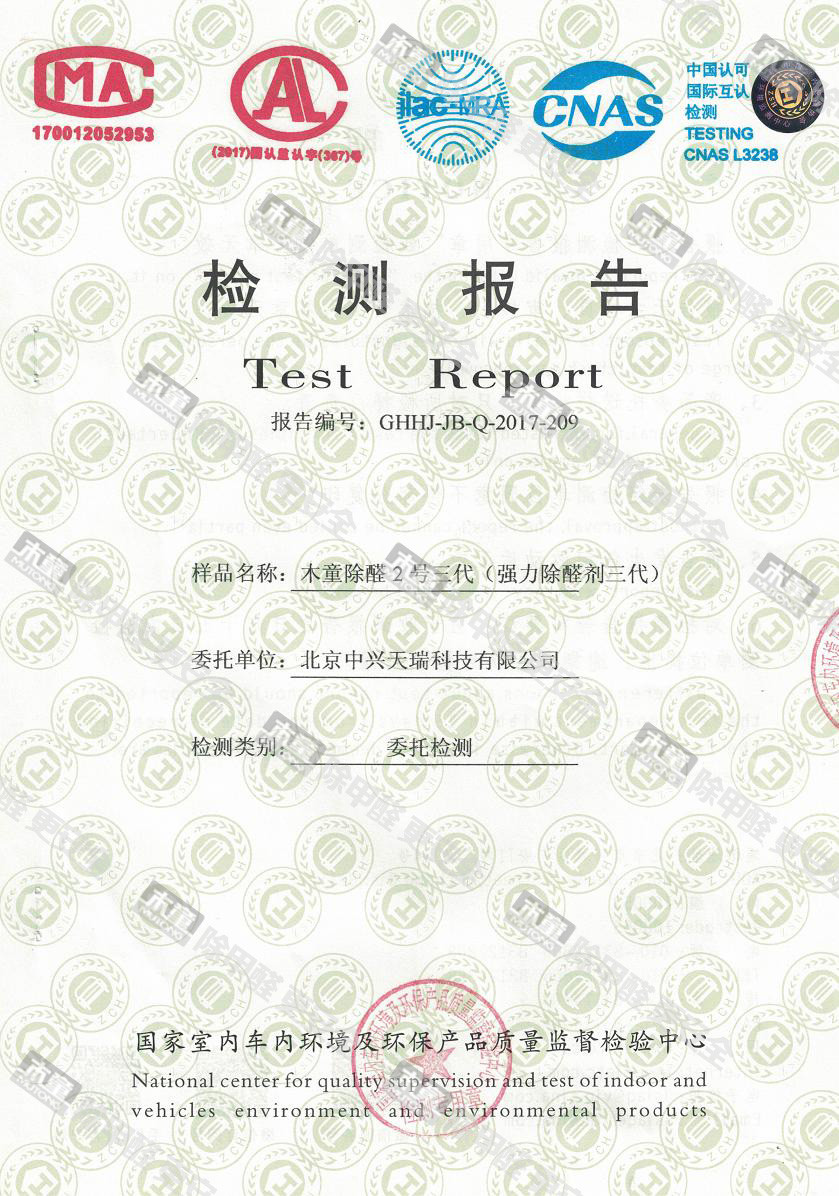 木童除醛2號(hào)三代效果檢驗(yàn)報(bào)告2017