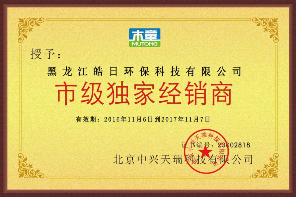 北京中興天瑞旗下木童除甲醛產(chǎn)品市級(jí)獨(dú)家經(jīng)銷(xiāo)商證書(shū)