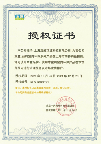 木童除甲醛上海經(jīng)銷商授權(quán)證書